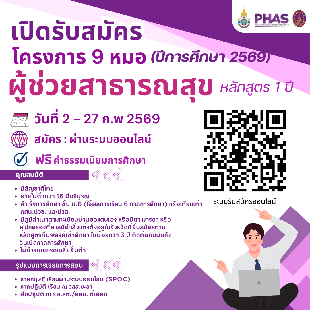 .. NEWS & ACTIVITIES There are no events. ข่าวการศึกษา ข่าวโครงการ/อบรม/สัมมนา ข่าวรับสมัครงาน ข่าวจัดซื้อจัดจ้าง รายงานการเงิน ข่าวการศึกษา เปิดรับสมัครโครงการ 9 หมอ หลักสูตรผู้ช่วยสาธารณสุข ปีการศึกษา 2569 เปิดรับสมัครนักศึกษาใหม่ หลักสูตรสาธารณสุขศาสตรบัณฑิต สาขาวิชาสาธารณสุขชุมชน (นอกเวลาราชการ) ประกาศรายชื่อผู้มีสิทธิ์เข้าศึกษา ระดับต่ำกว่าปริญญาตรี และประกาศรายชื่อผู้ผ่านการคัดเลือก ระดับปริญญาตรี (เพิ่มเติม) รอบที่ 1 Portfolio ปีการศึกษา 2569 ประกาศรายชื่อผู้ผ่านการคัดเลือก (เพิ่มเติม) ระดับปริญญาตรี และระดับต่ำกว่าปริญญาตรี รอบที่ 1 Portfolio ปีการศึกษา 2569 ประกาศรายชื่อนักศึกษาใหม่ ระดับต่ำกว่าปริญญาตรี รอบที่ 1 Portfolio ปีการศึกษา 2569 ประกาศรายชื่อผู้มีสิทธิ์เข้าสัมภาษณ์ รอบที่ 1 PORTFOLIO ปีการศึกษา 2569 ระดับปริญญาตรี และระดับต่ำกว่าปริญญาตรี ดูทั้งหมด… ข่าวโครงการ/อบรม/สัมมนา โครงการประชุมวิชาการ “Health Tech Forward: ยกระดับบุคลากร สาธารณสุขด้วยเทคโนโลยีและนวัตกรรมสุขภาพ” ปี 2568 โครงการอบรมข้าราชการบรรจุใหม่ หลักสูตรการเป็นข้าราชการที่ดี ประจำปีงบประมาณ 2567 กลุ่ม 3 โครงการอบรมหลักสูตรปฏิบัติการแพทย์ขั้นพื้นฐานและช่วยปฏิบัติการแพทย์ขั้นสูง (เกณฑ์เดิม+เพิ่มเติมเนื้อหาเกณฑ์ใหม่) โครงการอบรมบุคลากรสาธารณสุขในยุคดิจิทัล และนวัตกรรมกับการสร้างสุขภาวะอย่างยั่งยืน และการนำเสนอผลงานวิชาการ ปี 2567 และโครงการสัมมนาวิชาการ เรื่อง “จริยธรรมสำหรับผู้ให้บริการสุขภาพ (Ethics for Healthcare Providers)” โครงการประชุมวิชาการการแพทย์ฉุกเฉิน จังหวัดชายแดนภาคใต้ (ภายใต้ความร่วมมือทางวิชาการระหว่างวิทยาลัยการสาธารณสุขสิรินธร จังหวัดยะลาร่วมกับโรงพยาบาลยะลา โครงการสัมมนาข้าราชการบรรจุใหม่ หลักสูตรการเป็นข้าราชการที่ดี ประจำปีงบประมาณ 2566 กลุ่ม 5 เปิดรับสมัครนักศึกษาใหม่ ระดับปริญญาโท หลักสูตรสาธารณสุขศาสตรมหาบัณฑิต รอบที่ 1 ปีการศึกษา 2568 ประกาศรายชื่อผู้ผ่านการคัดเลือก (เพิ่มเติม) ระดับปริญญาตรี รอบที่ 1 Portfolio ปีการศึกษา 2568 รายชื่อผู้มีสิทธิ์เข้าศึกษา หลักสูตรประกาศนียบัตรวิชาชีพขั้นสูง รอบที่ 1 ปีการศึกษา 2568 ประกาศรายชื่อผู้มีสิทธิ์สัมภาษณ์ ระดับต่ำกว่าปริญญาตรี รอบที่ 1 ปีการศึกษา 2568 ดูทั้งหมด… ข่าวรับสมัครงาน ประกาศรับโอน/ย้าย ข้าราชการครูและบุคลกรทางการศึกษา ประกาศวิทยาลัยการสาธารณสุขสิรินธร จังหวัดยะลา เรื่อง รับสมัครงานจ้างเหมาบริการ ประกาศวิทยาลัยการสาธารณสุขสิรินธร จังหวัดยะลา เรื่อง รับสมัครงานจ้างเหมาบริการ ตำแหน่งนักวิชาการศึกษา ประกาศวิทยาลัยการสาธารณสุขสิรินธร จังหวัดยะ