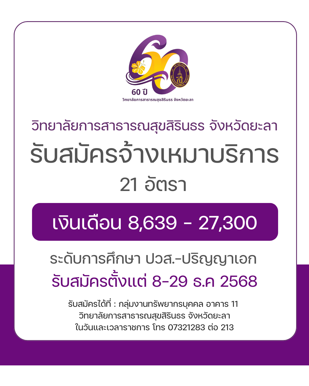 ข่าวรับสมัครงาน ประกาศวิทยาลัยการสาธารณสุขสิรินธร จังหวัดยะลา เรื่อง รับสมัครงานจ้างเหมาบริการ อ่านต่อ » ธันวาคม 11, 2025