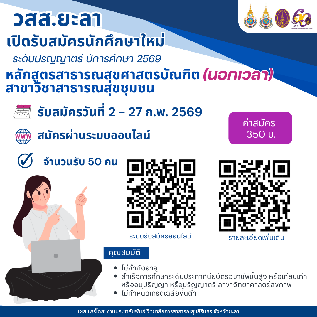 วิทยาลัยการสาธารณสุขสิรินธร จังหวัดยะลา เปิดรับสมัครและคัดเลือกบุคคลเข้าศึกษา